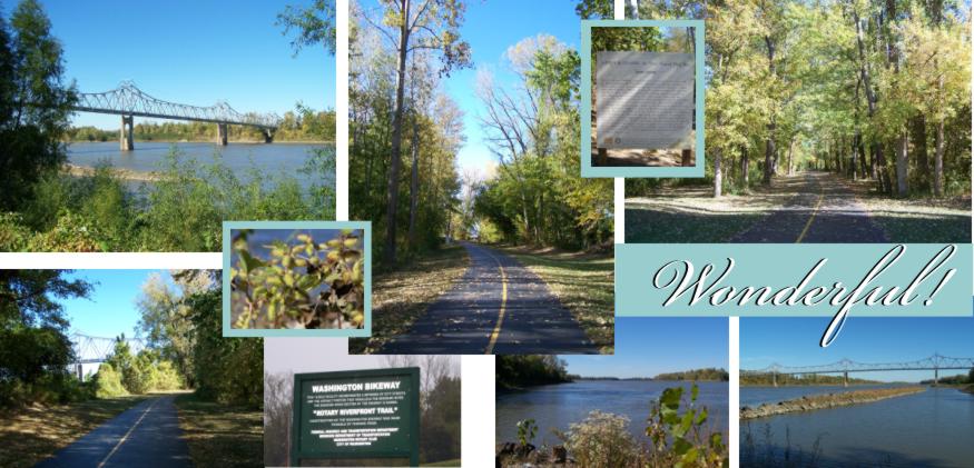 There's more to the Washington Riverfront than the river access, pavilions and park-like setting. If you look to the East from the lower parking lot you will find a paved trail that will make your walking or biking endeavor a breeze. Three miles there and back will produce a 6 mile jaunt total toward your good health! Or, you can do the whole trail and an "around town" route to make it a 12 miler! How energetic are you feeling? That sounds easy doesn't it? Fortunately, the beautiful views Really DO pass the time and the miles! Enjoy! |